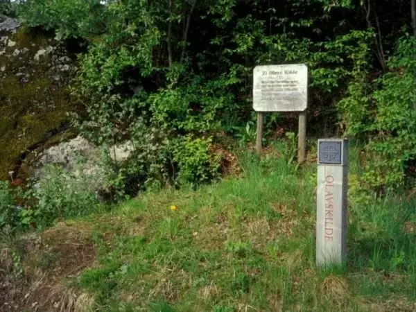 Helt inntil veien, nedenfor en stor seitn ligger et oppkomme, en Olavskilde.